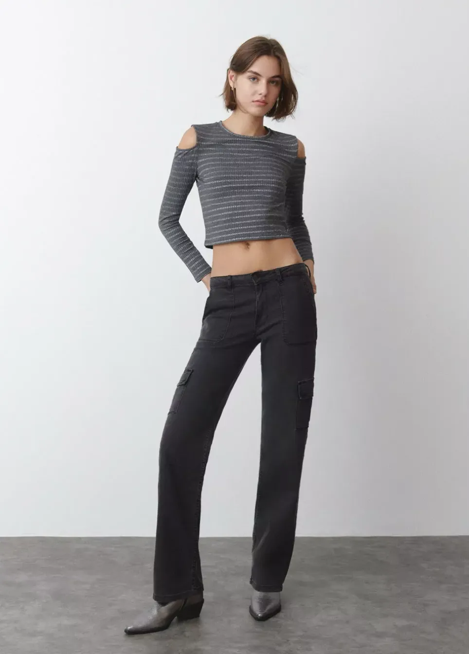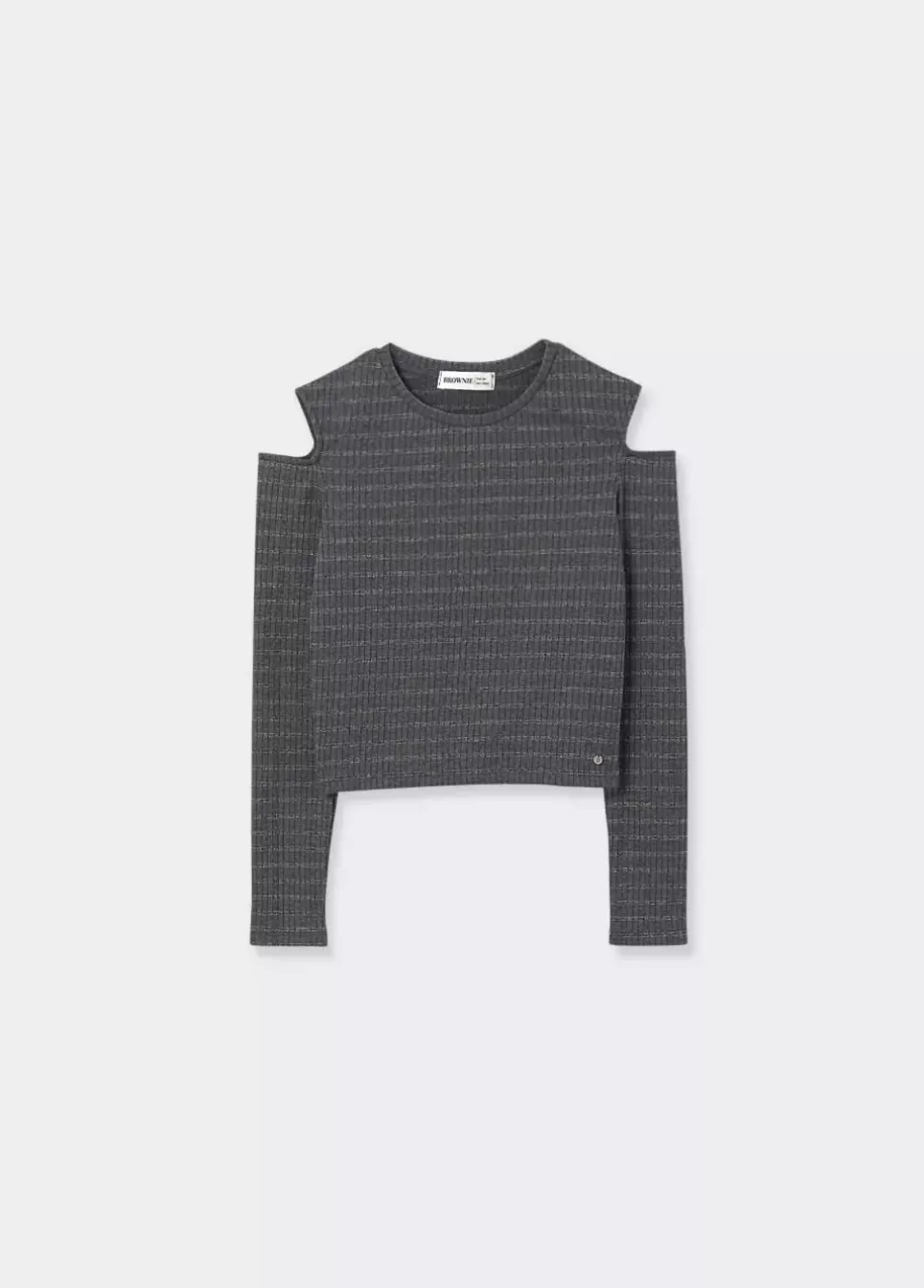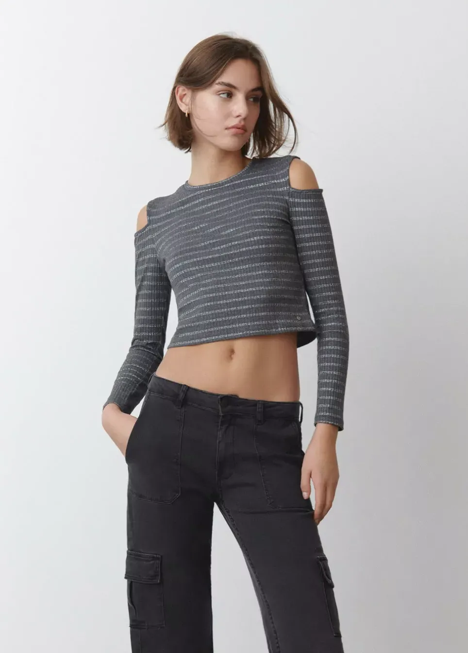 Camiseta De Rayas De Lurex De Manga Larga, Hombros Descubiertos Y Cuello Redondo.Composicion: