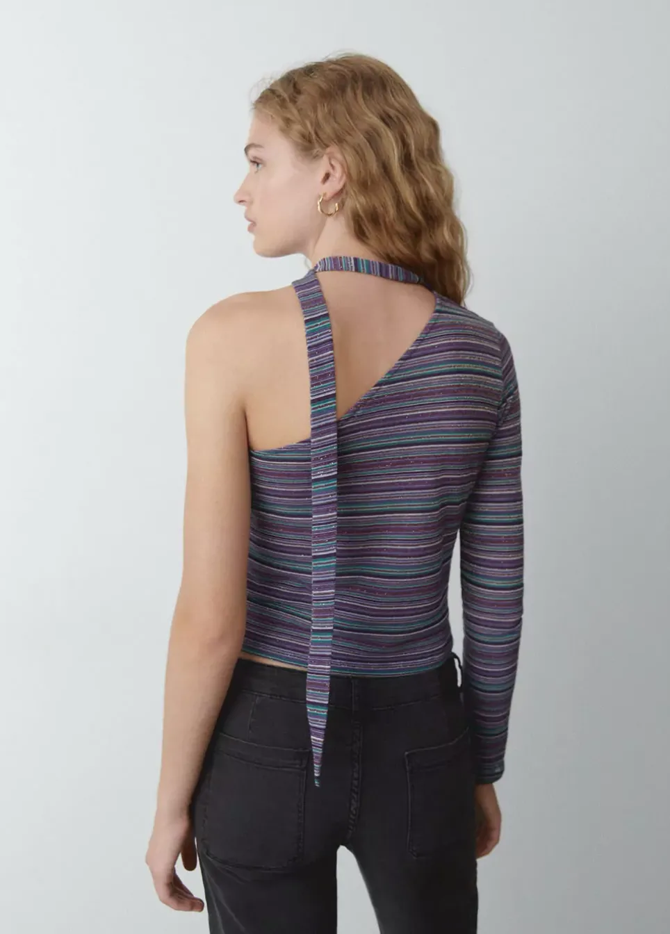 Camiseta Asimetrica De Rayas Con Una Manga Larga Y Detalle De Choker A Conjunto.Composicion: