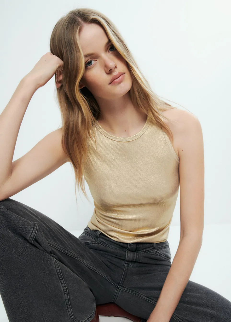Camiseta De Tirantes Metalizada En Dorado.