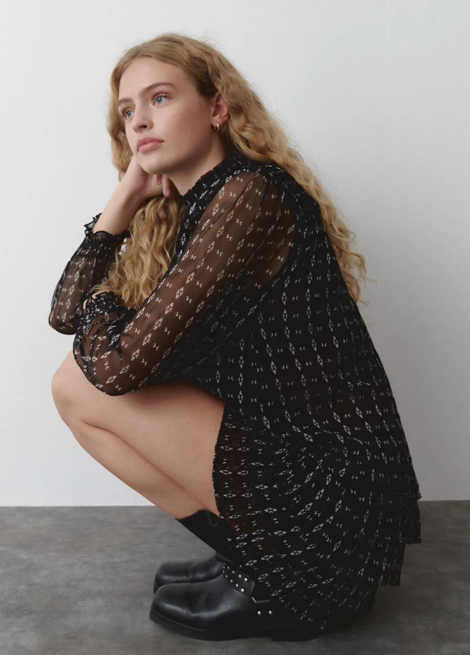 Blusa Estampada De Manga Larga Semitransparente Abullonada Y Cuello Alto Con Smock En La Parte Superior.Composicion: